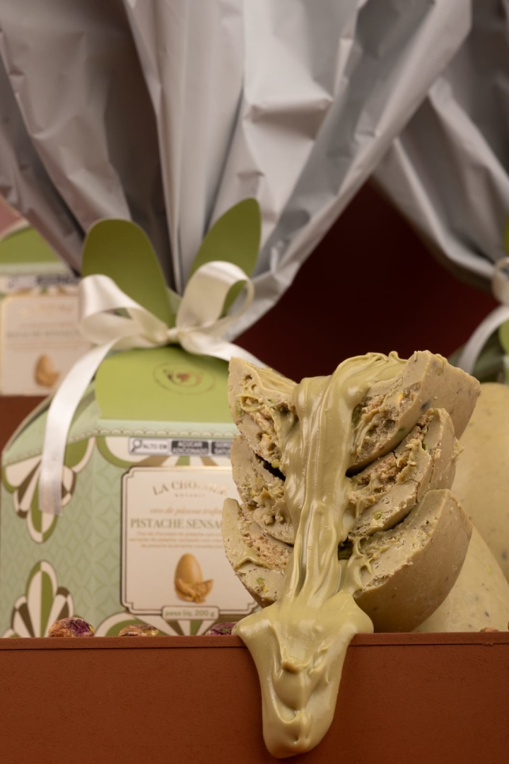 Ovo de chocolate branco com pasta de pistache recheado com creme aveludado de pistache levemente crocante com wafer.