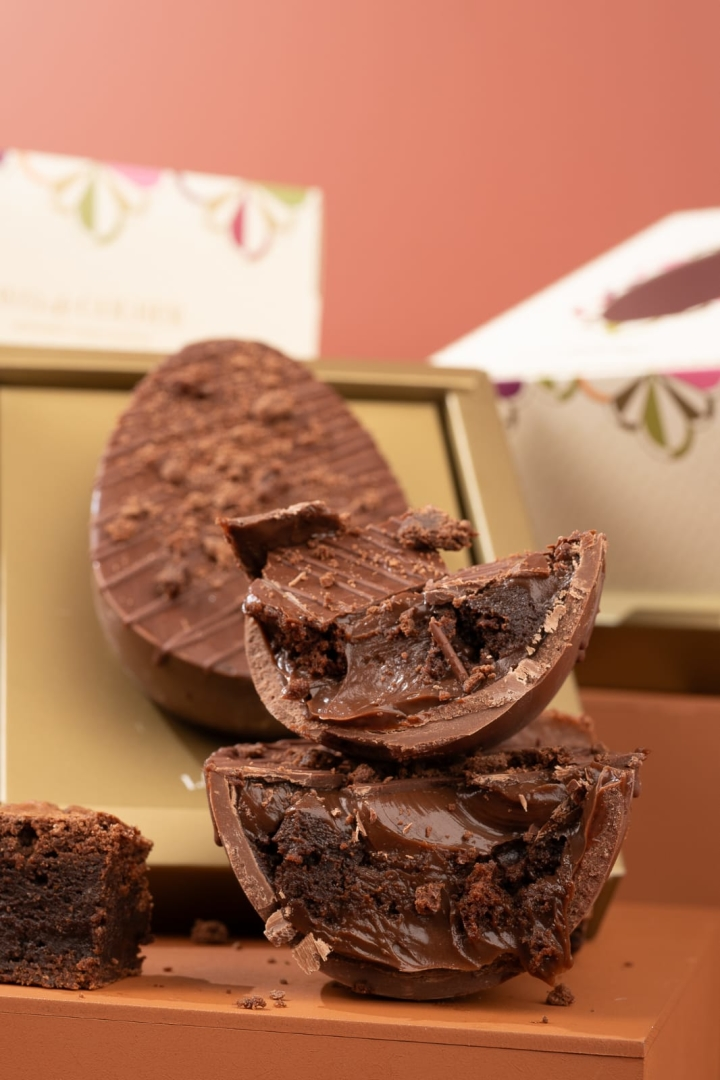 Casca de chocolate ao leite com nosso famoso brigadeiro belga e pedaços de brownie chocolate intenso.320g