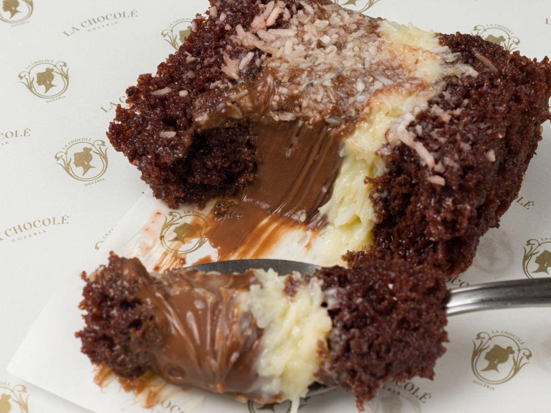 Bolo de chocolate molhadinho, recheado com brigadeiro de chocolate belga e cocada cremosa, embrulhado em papel aluminio especial
