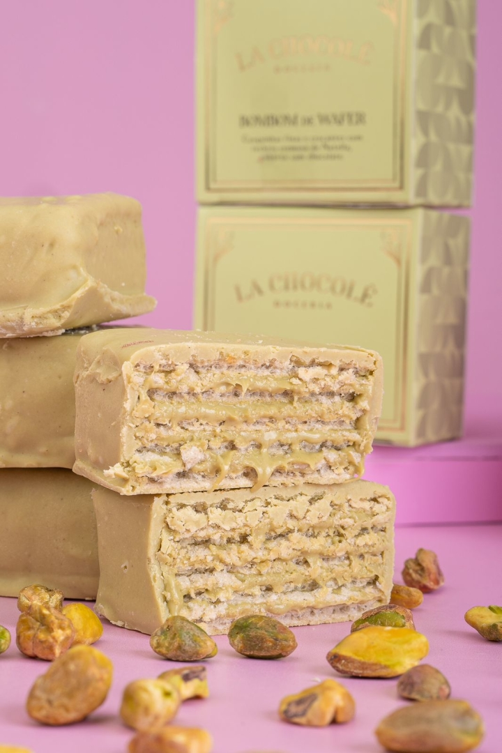 Placas de crocantes de wafer recheado com creme de Pistache coberto com chocolate de pistache 90g
